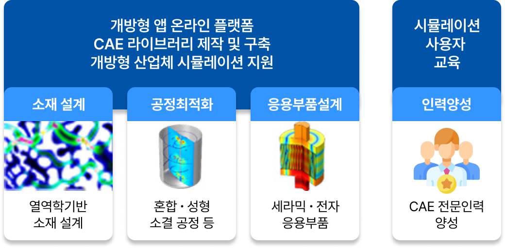 세라믹·전자 소재 적용 IoT 관련 소재 설계·응용부품설계·공정 최적화의 시뮬레이션 기술을 이용하여 산업체의 현장애로기술을 지원하고 개발된 기술의 신뢰도를 평가하는 플랫폼을 개발함으로써 이 같은 기술을 산업체에 확산 및 보급하여 4차 산업혁명 능력 향상을 꾀하고 산업체 투입될 전문 인력을 양성하여 파급 효과를 극대화 하고자 합니다